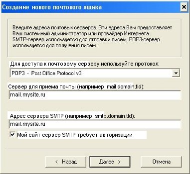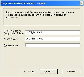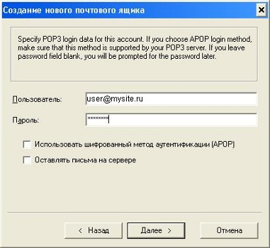 4. Введите SMTP server своего провайдера доступа и POP3 server: mail.ADRES_VASHEGO_SAYTA.ru