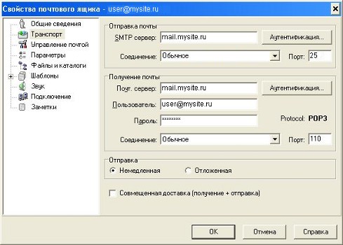 7. В появившемся окне выберите раздел "Траспорт". В пункте "Отправка почты" нажмите кнопку "Аутентификация". (*)