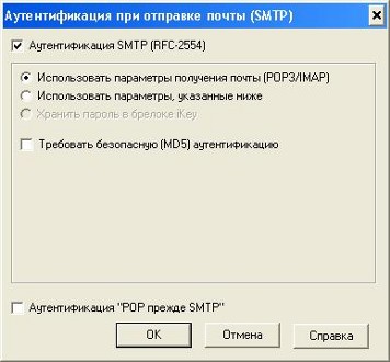 8. Проверьте чтобы была выбрана аутентификация как для сервера входящей почты: отметьте "Аутентификация SMTP (RFC2554)" и "Использовать параметры получения почты (POP3/IMAP)".