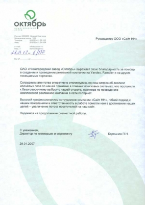 ОАО «Нижегородский завод «Октябрь» выражает свою благодарность за помощь в создании и проведении рекламной компании на Yandex, Rambler и на других посещаемых порталах.