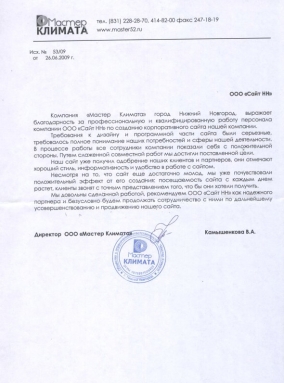Компания «Мастер Климата» город Нижний Новгород выражает благодарность за профессиональную и квалифицированную работу персонала компании ООО «Сайт НН» по созданию корпоративного сайта нашей компании.