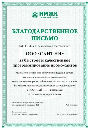 ЗАО ТД «НМЖК» выражает благодарность ООО «Сайт НН» за быстрое и качественное программирование промо-сайтов. Мы высоко ценим Ваш творческий подход к работе, желание и возможность решать любые возникающие вопросы, соблюдение поставленных сроков. Выражаем глубокое удовлетворение сотрудничеством с ООО «Сайт НН» и надеемся на его успешное продолжение.