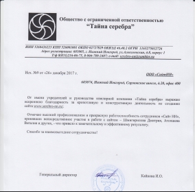 От имени учредителей и руководства ювелирной компании «Тайна серебра» выражаю искреннюю благодарность за кропотливую и конструктивную деятельность по созданию сайта www.serebro-nn.ru/.