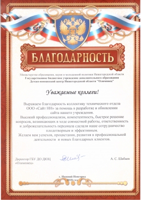 Выражаем благодарность коллективу технического отдела ООО "Сайт НН" за помощь в разработке и обновлении сайта нашего учреждения.