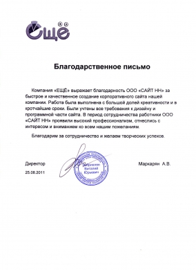 Компания "ЕЩЕ" выражает благодарность ООО "Сайт НН" за быстрое и качественное создание корпоративного сайта нашей компании. Работа была выполнена с большой долей креативности и в кратчайшие сроки. Были учтены все требования к дизайну и программной части сайта. В период сотрудничества работники ООО "Сайт НН" проявили высокий профессионализм, отнеслись с интересом и вниманием ко всем нашим пожеланиям.