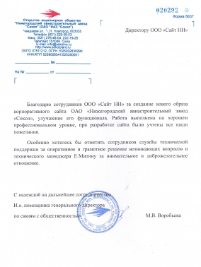 Благодарю сотрудников ООО "Сайт-НН" за создание нового образа корпоративного сайта ОАО "Нижегородский авиастроительный завод "Сокол", улучшение его функционала. Работа выполнена на хорошем профессиональном уровне, при разработке сайта были учтены все наши пожелания.
