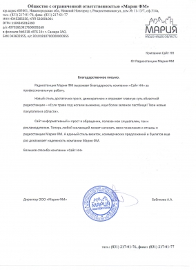 Радиостанция Мария ФМ выражает благодарность компании "Сайт НН" за профессиональную работу.