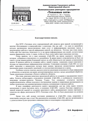 В виду специфики деятельности нашего предприятия, для нас очень важно показать организацию в cамoм выгодном свете, и компании "Сайт НН" удалось блестяще справиться с данной непростой задачей по созданию креативного сайта, раскрывающего нашим партнерам и клиентам все сферы деятельности МУП "Тепловые сети", Все это было реализовано на должном уровне.