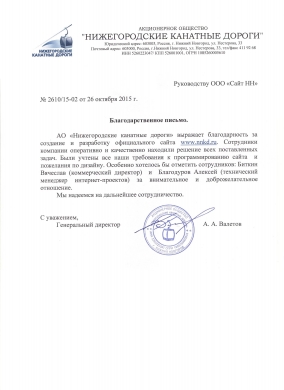 АО "Нижегородские канатные дороги" выражает благодарность за создание и разработку официального сайта www.nnkd.ru. Сотрудники компании оперативно и качественно находили решение всех поставленных задач. Были учтены все наши требования к программированию сайта и пожелания по дизайну. Особенно хотелось бы отметить сотрудников: Биткин Вячеслав (коммерческий директор) за внимательное и доброжелательное отношение.