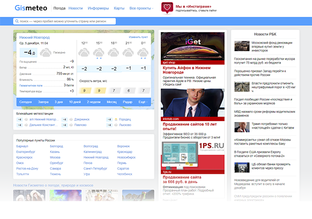 Для тематической рекламы нет строго определенного расположения: объявления будут размещаться там, где владелец ресурса выделит для этого место. Например, на сайте gismeteo.ru это выглядит так :