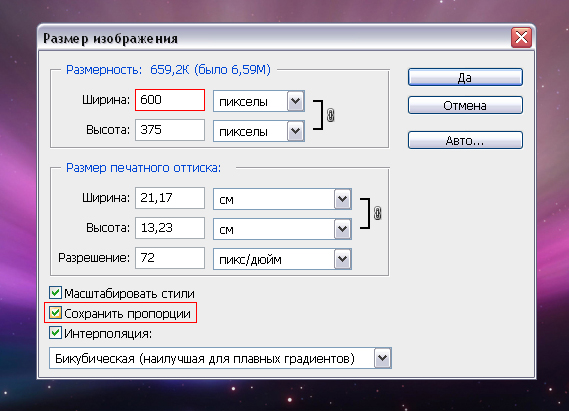 В поле width (ширина) выставляем нужный размер картинки в пикселях. Чтобы при изменении размера картинки соблюдались пропорции, должна стоять галочка в поле Constraip Proportions (Сохранять пропорции).