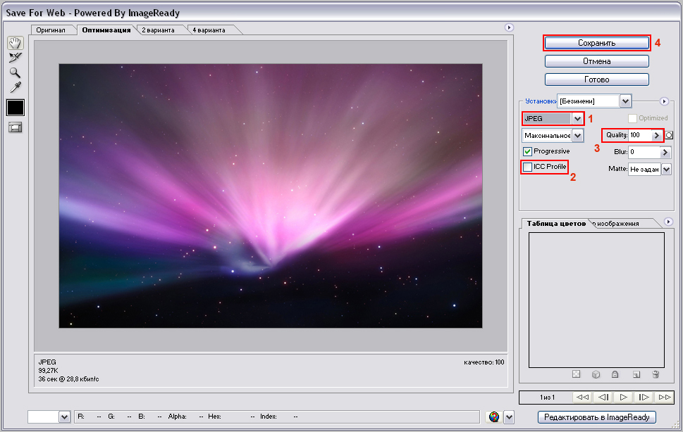 4. При сохранении файла галочка ICC Profile не должна стоять (№2). Затем выбираем качество сохраняемого изображение (№3). Чем выше качество, тем будет больше "весить" файл. Обычно среднего (medium) качества бывает достаточно.