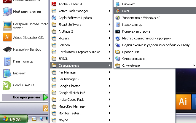 1. Необходимо нажать кнопку "Пуск", выбрать "Программы", "Стандартные", "Paint"
